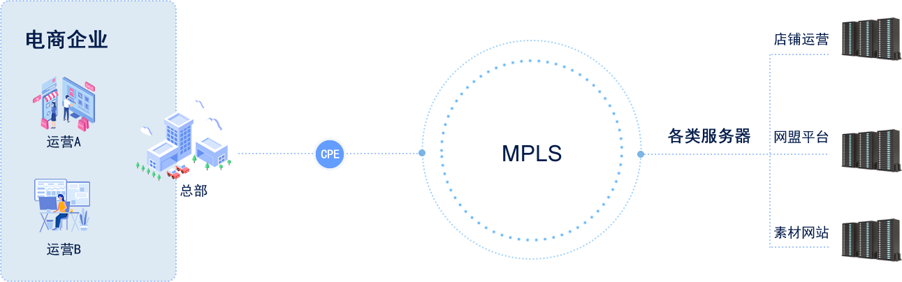 业务发展快速,受限于传统广域网接入方式,带宽扩容能力不足而且重新部署 耗时长,无法满足电商平台的高速发展。